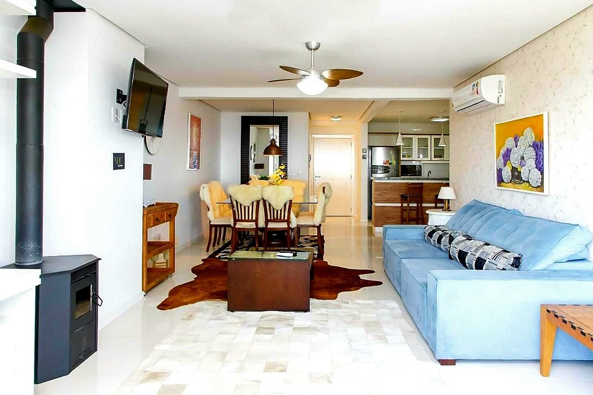 A comfortable living room with air conditioning (hot/cold), Smart TV and fireplace;