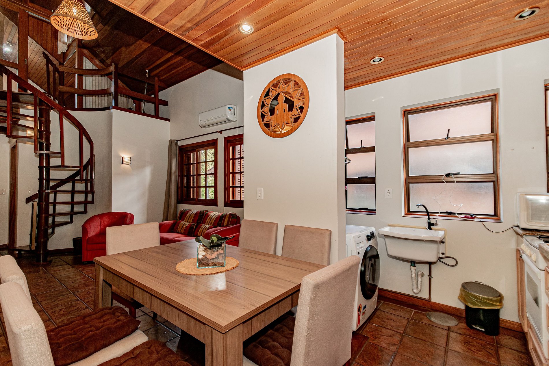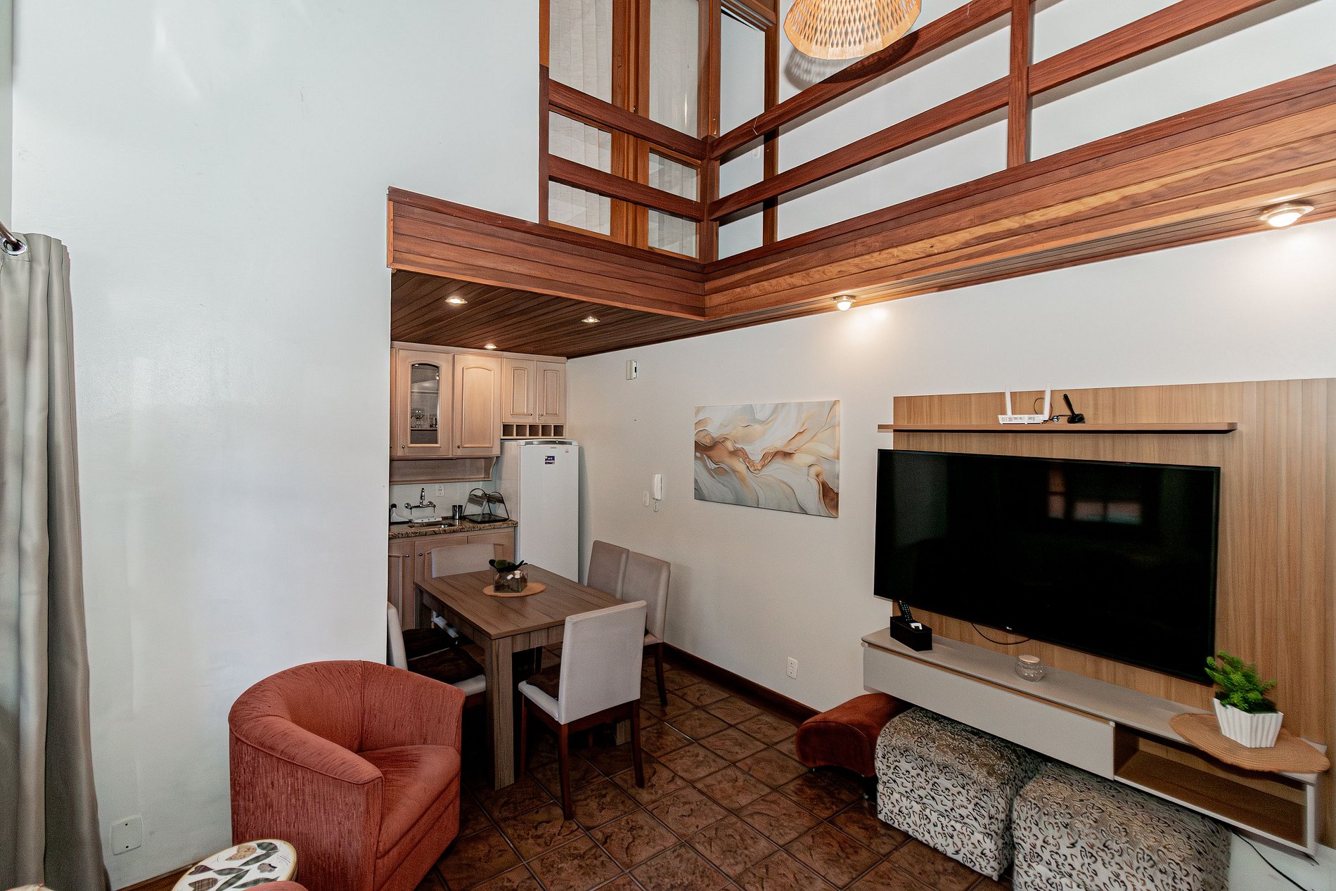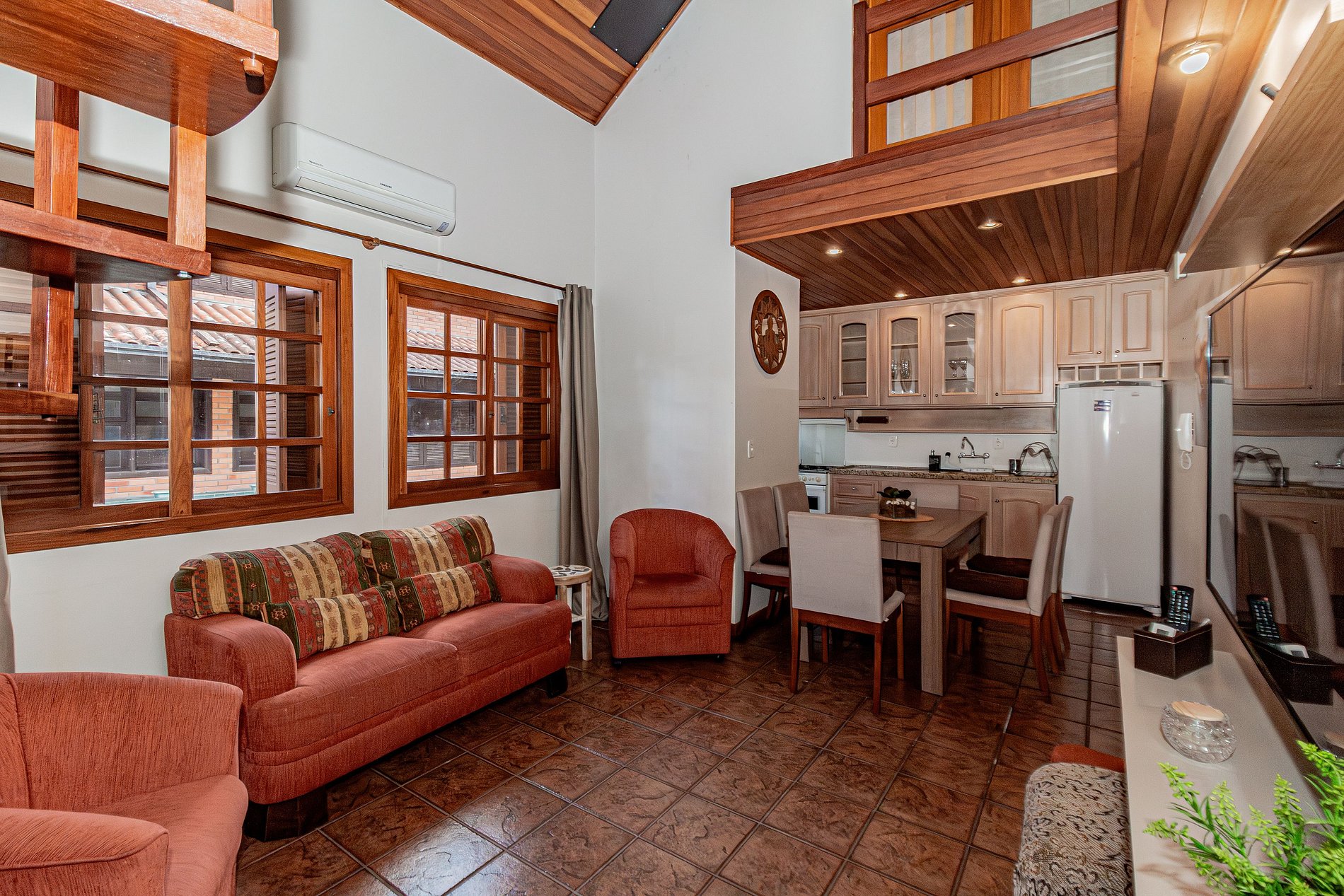Primeiro Pavimento: Área social integrada com sala de estar aconchegante, equipada com ar-condicionado para o seu máximo conforto térmico. A cozinha é completa e pronta para o preparo de refeições. Neste andar, encontra-se também um dormitório climatizado.