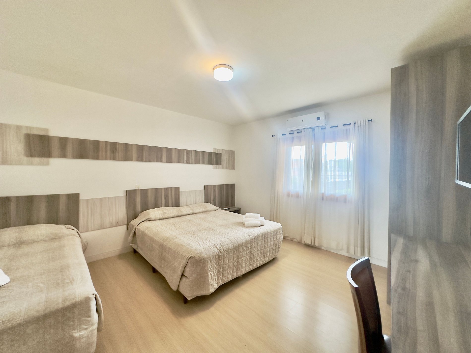 Apartamento com quartos amplos, camas e edredons bons, todo climatizado.