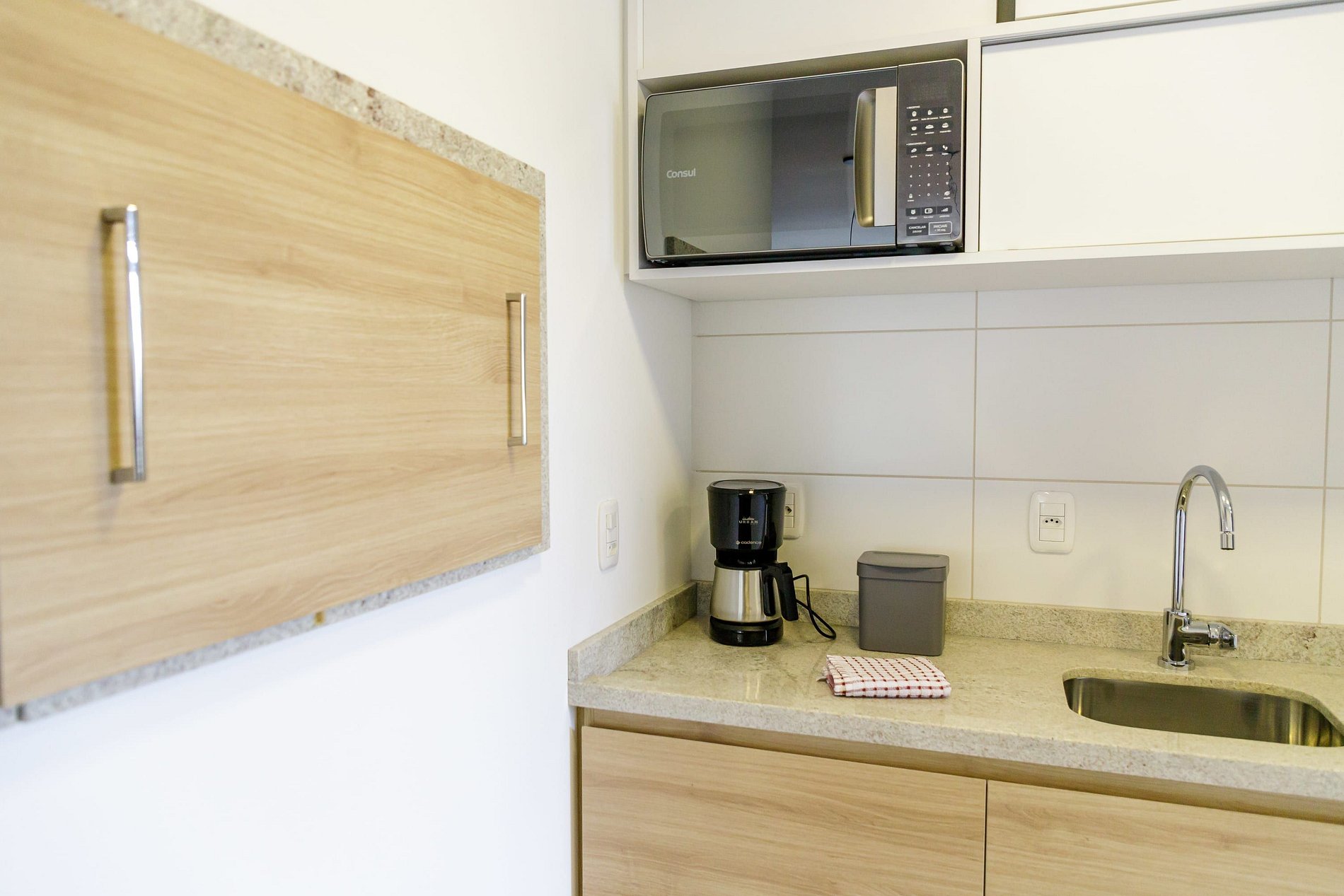 Cozinha completamente equipada com eletrodomésticos modernos e uma churrasqueira;