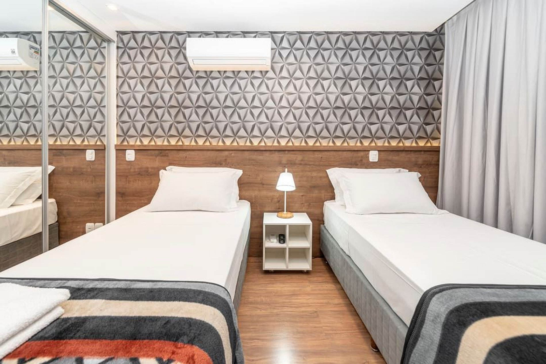 01 quarto com duas camas de solteiro, ar condicionado (quente e frio) e TV;